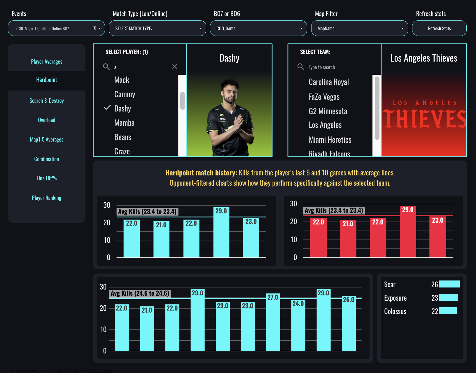 Enter the book line + map/opponent/mode to see a player’s historical hit %. Quick, clear, prop-ready.